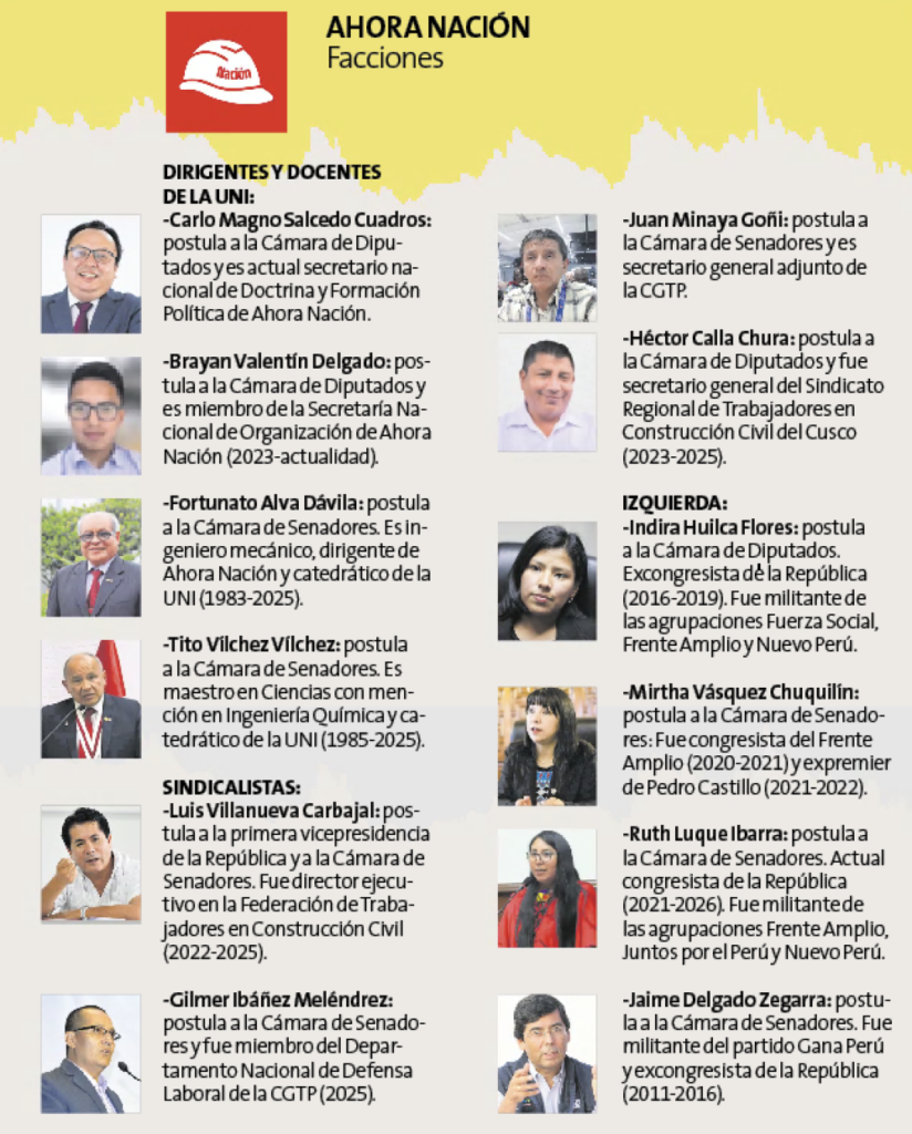 Por un lado, está el grupo de docentes de la UNI y dirigentes de Ahora Nación que aspiran a ser diputados y senadores, entre los que destacan Carlo Magno Salcedo, exmiembro del CEN del Partido Morado, y los catedráticos Fortunato Alva y Tito Vílchez, todos ellos con militancia vigente. Cabe precisar que el mismo López-Chau también postula al Senado.
