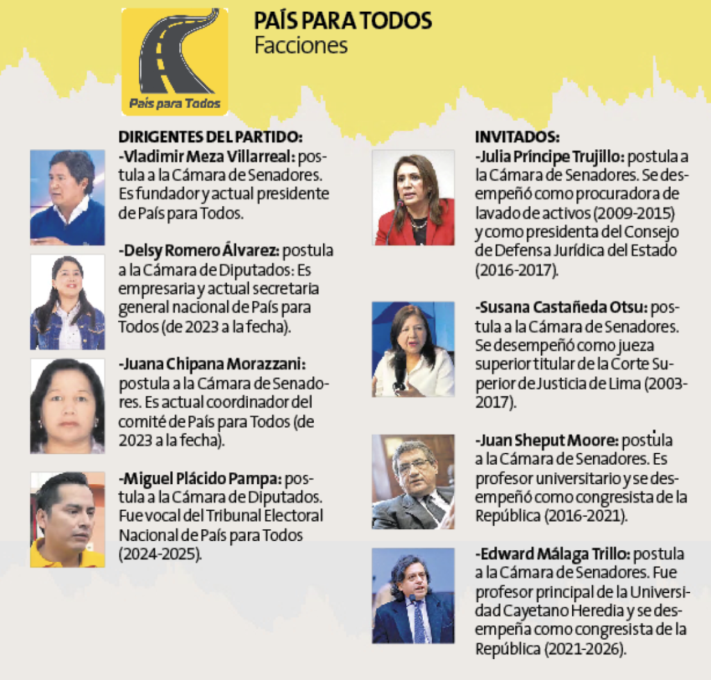 Al igual que las agrupaciones anteriores, País para Todos, que lidera Carlos Álvarez, tiene dos grupos identificados. El primer grupo —y hegemónico— está conformado por los dirigentes del partido, entre los que figuran Vladimir Meza Villarreal, quien es fundador de la agrupación.