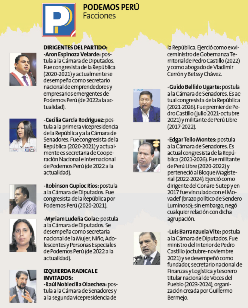 Otro partido que tiene facciones visibles es Podemos Perú, que lidera José Luna Gálvez. Por un lado, destacan dirigentes del partido como Aron Espinoza, quien postula a la Cámara de Diputados, y los excongresistas Cecilia García, aspirante al Senado y a la primera vicepresidencia de la República, y Robinson Gupioc, que busca ser diputado.