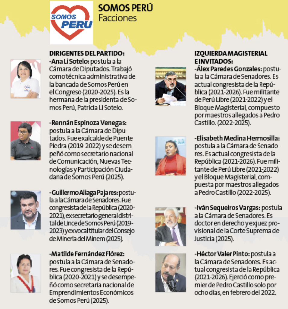 Somos Perú también registra dos grupos internos. La primera facción está conformada por los dirigentes y exlegisladores del partido. En este bloque figuran Ana Li Sotelo, hermana de la fundadora del partido, Patricia Li Sotelo; Rennán Espinoza Venegas, exalcalde de Puente Piedra, y Guillermo Aliaga, quien se desempeñó como vocal titular del Consejo de Minería del Minem durante el gobierno de José Jerí.