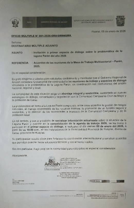 Diversos sectores de la población caracina, la campiña y la Comunidad Campesina Cruz de Mayo han expresado su preocupación tras conocerse el contenido de la agenda de diálogo 2026 impulsada por el Gobierno Regional de Áncash en relación a la Laguna Parón, al considerar que varios de los puntos planteados podrían poner en riesgo el equilibrio hídrico y ambiental de este importante ecosistema.