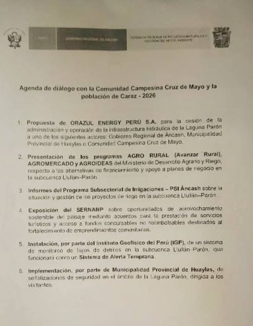 De acuerdo con la documentación oficial, dentro de la agenda se incluye la propuesta de la empresa privada Orazul Energy Perú S.A., orientada a la cesión de la administración y operación de la infraestructura hidráulica de la Laguna Parón, lo que, según dirigentes y pobladores, podría derivar en un desagüe progresivo o uso intensivo de sus aguas, afectando directamente a la laguna, la agricultura, el turismo y la seguridad hídrica de Caraz.