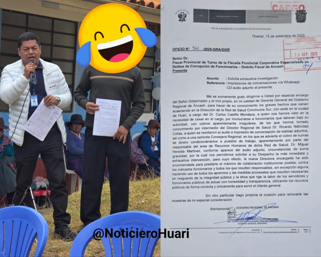 Hoy 15 de setiembre de 2025, el gerente general regional, Marco La Rosa Sánchez Paredes, solicitó al Fiscal Provincial de Turno de la Fiscalía Provincial en Delitos de Corrupción de Funcionarios de Ancash, el inicio de una exhaustiva investigación sobre los presuntos actos de corrupción en la Red de Salud Conchucos Sur, a cargo de Carlos Castillo Mundaca, quien fue removido al verse involucrado a funcionarios que laboran bajo su mandato, con cobros aparentemente irregulares.