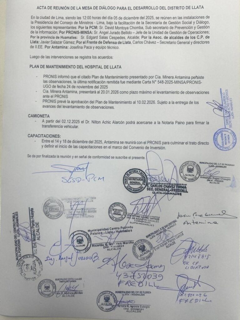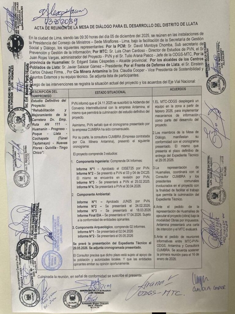 Durante la reunión realizada el 5 de diciembre de 2025, representantes de la Presidencia del Consejo de Ministros (PCM), la minera Antamina y Provías Nacional acordaron extender la fecha de entrega en casi seis meses.