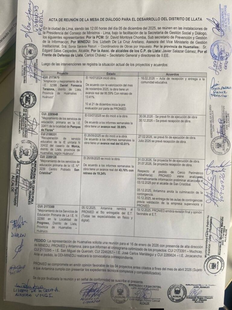 La población de Llata y la provincia de Huamalíes (Huánuco) expresó profunda indignación tras confirmarse un nuevo retraso en la entrega del Expediente Técnico Definitivo del proyecto vial Antamina – Llata – Tingo Chico, una obra esperada por más de 11 años y considerada crucial para el desarrollo económico y social de la zona.