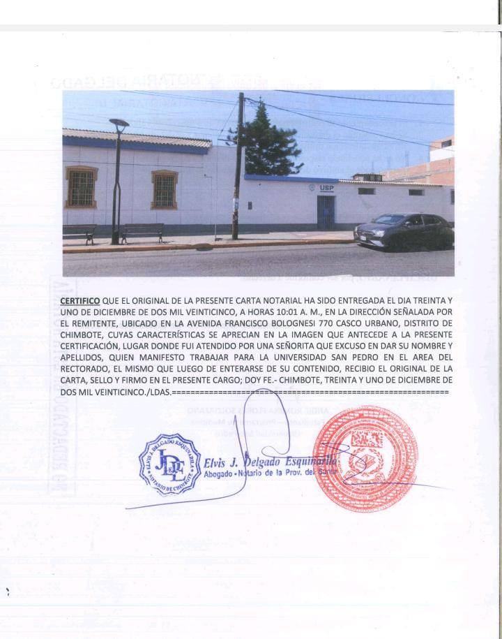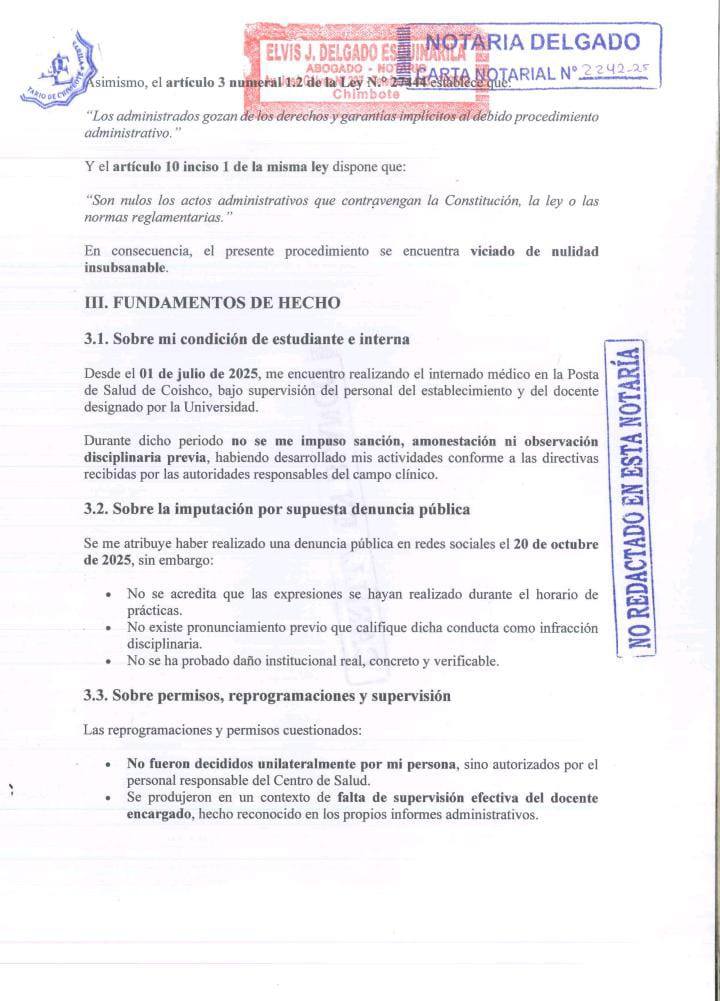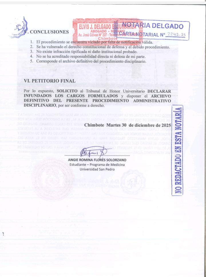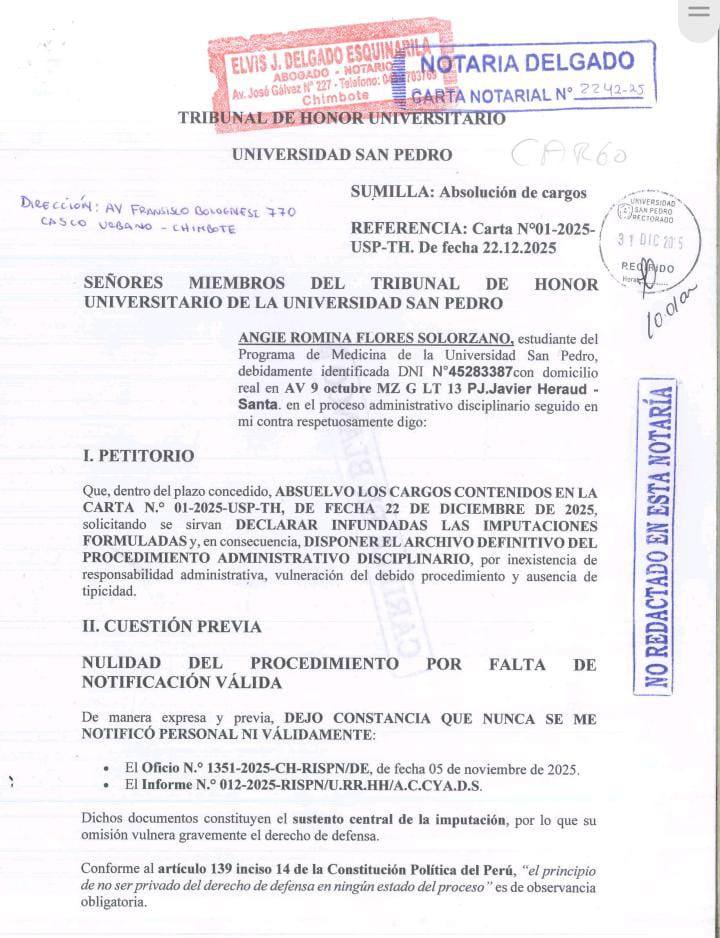 La interna de Medicina Angie Flores Solórzano, estudiante de la Universidad San Pedro (USP), hizo pública una contestación notarial dirigida al Tribunal de Honor Universitario, en la que denuncia presuntas irregularidades, abusos de autoridad y vulneración del debido proceso en el procedimiento administrativo disciplinario iniciado en su contra.