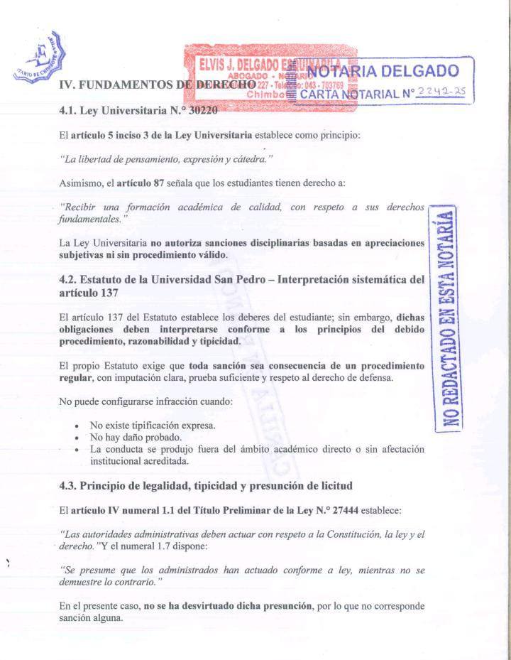 Asimismo, sostiene que, conforme al artículo 137 del Estatuto de la Universidad San Pedro, no puede configurarse infracción disciplinaria cuando no existe tipificación expresa, daño probado ni afectación institucional acreditada, condiciones que según afirma no se presentan en su caso.