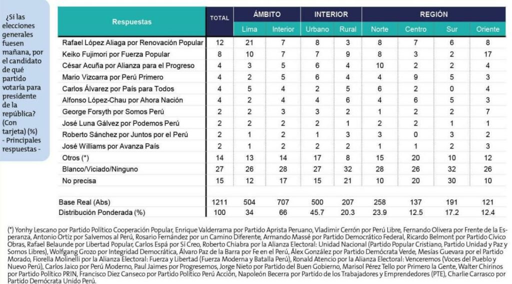 Más atrás, George Forsyth (Somos Perú), José Luna Gálvez (Podemos Perú), Roberto Sánchez (Juntos por el Perú) y José Williams (Avanza País) con 2%, parecen desmarcarse del resto de postulantes sin visibilidad en el cuadro principal y que por ahora integran el grupo de otros (14%).