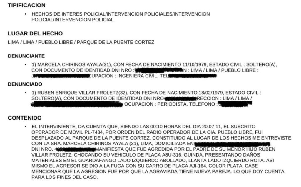 La denuncia la hizo la madre de Adrián, Marcela Chirinos Ayala. La razón de la agresión fue, según el documento, “porque la agraviada tiene nueva pareja”.