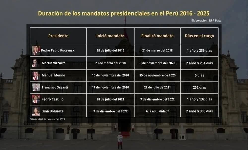 📌Desde el año 2016, el Perú ha atravesado una inusual inestabilidad política, con seis mandatarios que, en promedio, solo han permanecido un año y tres meses en el cargo.