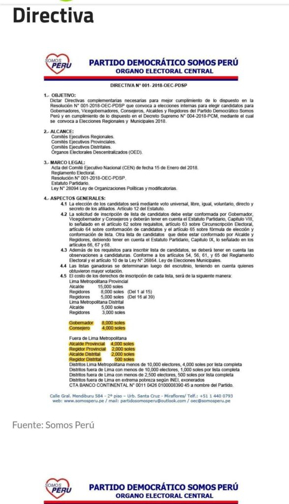 Esta preocupación hizo que este precandidato viaje a Lima e investigue por su cuenta descubriendo la existencia de la Directiva 01 emitido por el Órgano Electoral Central de Somos Perú, en vigencia desde 2018 a la fecha, que confirma los cobros mencionados como requisito para postular.